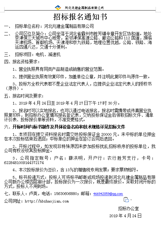 - 招標(biāo)業(yè)主: 河北兆建金屬制品有限公司
