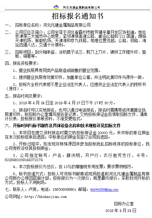 • 招標(biāo)業(yè)主: 河北兆建金屬制品有限公司