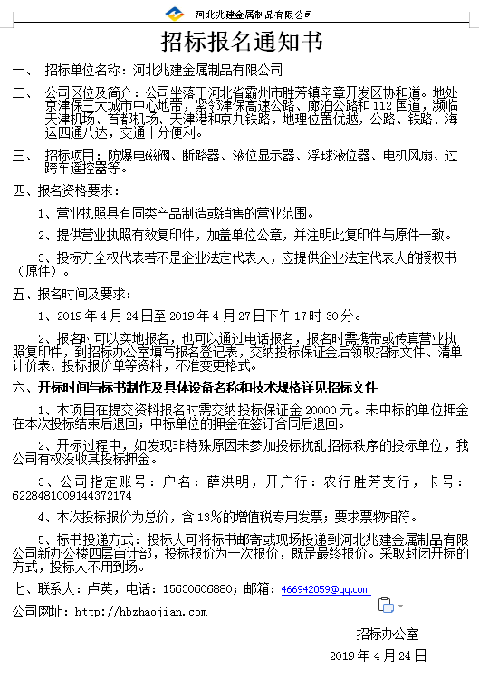 - 招標業(yè)主: 河北兆建金屬制品有限公司